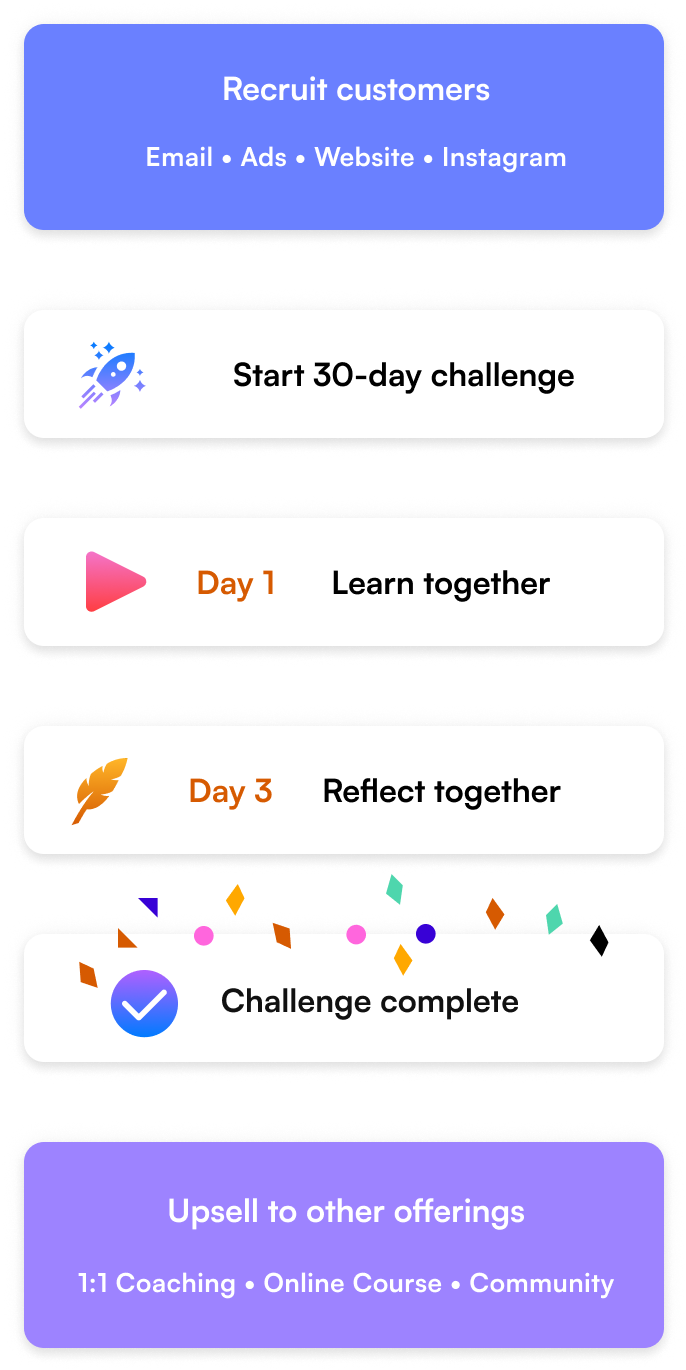 A Challenge is a time-bound learning journey with a clearly defined goal that has been broken down into manageable action steps. These action steps (whether they are daily, weekly or at a frequency of your choice) make the challenge’s end goal feel more attainable as the participants make measurable progress towards their goal each day.